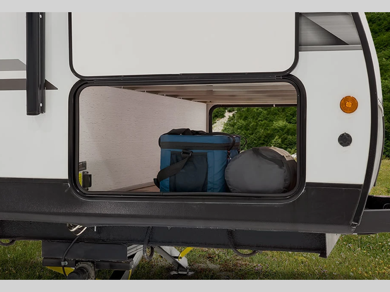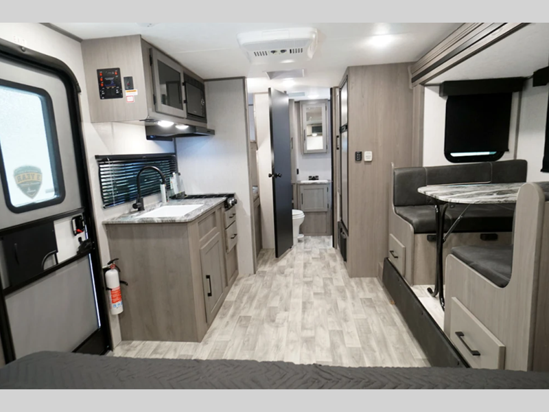 The hybrid aluminum steps give you stability as you enter and exit the unit and are easy to expand or store away when you are traveling. With a standard 13,500 BTU A/C unit, you will stay cool even on the hottest summer days, and the on-demand tankless water heater will provide endless hot showers. You will love the look of the seamless countertops and the Home Series interior collection decor, and there is HyperDeck flooring that is durable and easy to keep clean!