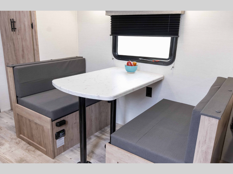 The seamless synthetic vinyl roof and diamond plate lower front provide a durable trailer made to last, and the high-performance vinyl flooring throughout will be easy to keep clean. Each model includes LED interior lights, wood ceiling trim, laminated countertops with vinyl T-molding, and many more interior comforts. You will also appreciate the tankless water heater, the multiple USB ports to keep your electronics charged, and the power awning that will provide shade while you visit outdoors.