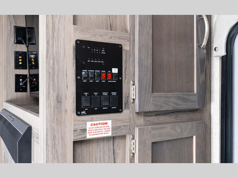 Some of the luxury features that are sure to catch your attention are the stainless steel appliances, the solid surface kitchen countertops, and the solid wood cabinet doors and stiles. A power tongue jack and exterior docking station will make set-up easier than ever, and the walk-on roof with a ladder will allow you to easily clean the top of your trailer after staying at the campground.