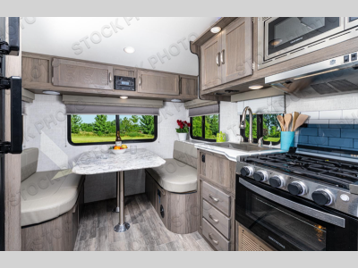 You will feel right at home in this travel trailer with the front queen bed that has privacy curtains to draw at night and shirt closets! The separated bathroom makes it easy for one to take a hot shower while another washes up for dinner. You can prepare delicious home cooked meals with the three burner cooktop and enjoy them at the rear booth dinette. The dinette can also transform into an extra sleeping space and there is a TV mount location diagonal to it also!