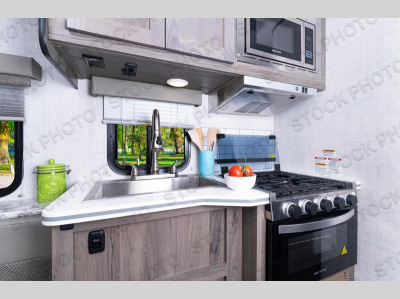 Enjoy the comforts of home while at the campsite in this travel trailer! Up front there are two twin beds with an insert for a king bed. The separated bathroom makes it easy for one to freshen up in the shower while another washes up for dinner in the private toilet and sink right across the hall. The rear booth dinette is great for enjoying a meal, playing a card game, and even transforming into an extra sleeping space. The flat floor entry helps to keep you from tripping when entering or exiting. The microwave above the three burner cooktop is just waiting for you to pop the perfect bag of popcorn on movie night!