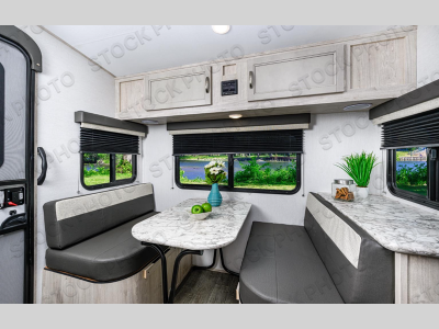 You will appreciate how versatile this travel trailer is! It features two front 32" x 80" twin beds with an insert for a king bed, plus a night stand with a drawer to keep your valuables secure. The separated bathroom allows one person to rinse the sand out of their hair in the shower while another uses the private lavatory and sink. The booth dinette is not only great for enjoying a meal or playing a card game, but also for transforming into an extra sleeping space. The sofa slide can also be another sleeping space, and the flat floor entry helps keep everyone from tripping as they enter or exit!